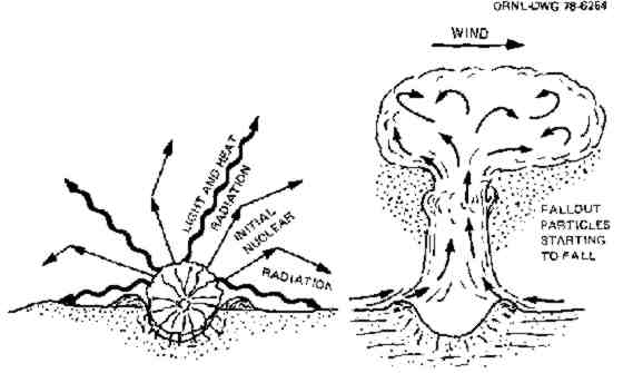 The main dangers from an air burst are the blast effects, the thermal pulses of intense light and heat radiation, and the very penetrating initial nuclear radiation from the fireball. ORNL.DWG 78.6267