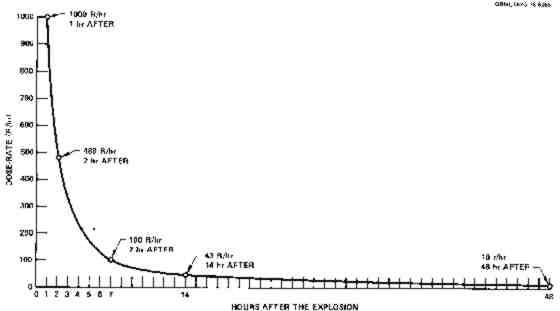 If the dose rate 1 hour after an explosion is 1000 R/hr, it would take about 2 weeks for the dose rate to be reduced to 1 R/hr solely as a result of radioactive decay. Weathering effects will reduce the dose rate further,' for example, rain can wash fallout particles from plants and houses to lower positions on or closer to the ground. Surrounding objects would reduce the radiation dose from these low-lying particles.