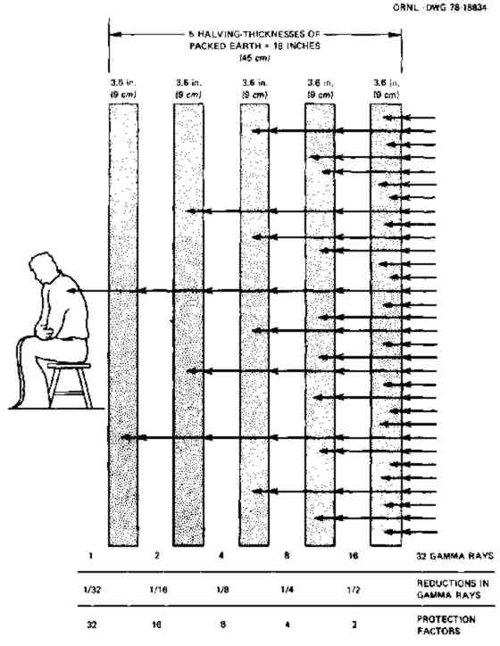 ° Facts: Some gamma radiation from fallout will penetrate the shielding materials of even an excellent shelter and reach its occupants. However, the radiation dose that the occupants of an excellent shelter would receive while inside this shelter can be reduced to a dose smaller than the average American receives during his lifetime from X rays and other radiation exposures normal in America today. The design features of such a shelter include the use of a sufficient thickness of earth or other heavy shielding material. Gamma rays are like X rays, but more penetrating. Figure 1.3 shows how rapidly gamma rays are reduced in number (but not in their ability to penetrate) by layers of packed earth. Each of the layers shown is one halving-thickness of packed earth- about 3.6 inches (9 centimeters).3 A halving- thickness is the thickness of a material which reduces by half the dose of radiation that passes through it.