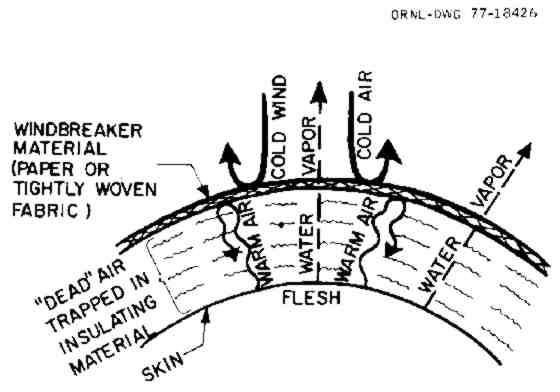 ° Trap "dead" air. Covering enough of your body with a thick layer of trapped "dead" air is the basic requirement for keeping warm. Figure 15.1 shows how efficient body insulation works: Both the air warmed by close contact with the skin and the water vapor from evaporated perspiration flow outward into the insulating material. Any material that breaks up and separates air into spaces no more than 1/8 inch