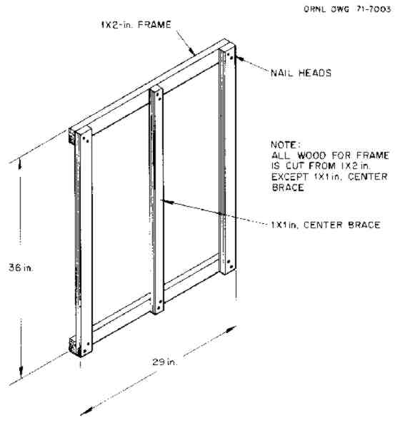 a. Cut two pieces of 1 X 2-in. boards, each 36 in. long, and two pieces of 1 X 2-in. boards, each 29 in. long; then nail them together (see Fig. 3). Use nails that do not split the wood, preferably long enough to go through the boards and stick out about 1/2 in. on the other side. (To nail in this manner, first put blocks under the frame so that the nail points will not strike the floor.) Bend over nail points which go through.