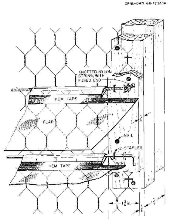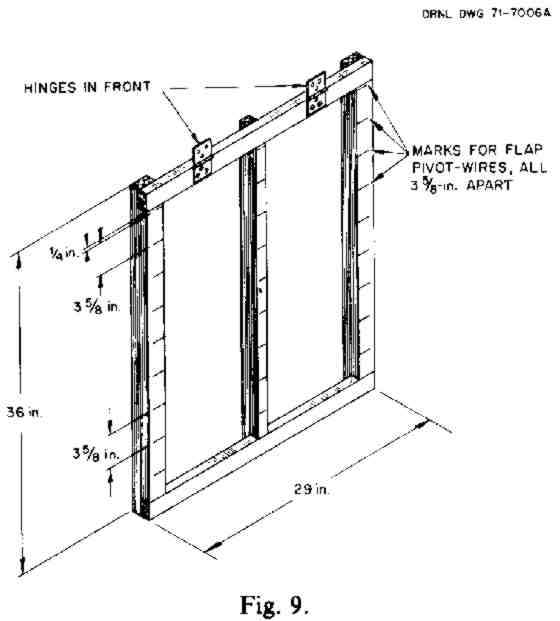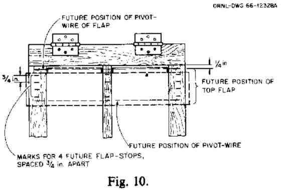 a. Staple, nail, or tie the 9 flap pivot-wires or pivot-strings (each with its flap attached) in their positions at the marked 3-5/8 in. spacings. Start with the lowest flap and work upward (see Fig. 11). Connect each pivot-wire at both ends to the 36-in. vertical sides of the frame. Also connect it to the vertical brace. BECAREFUL TO NAIL THE PIVOT-WIRES ONLY TO THE FRAME AND THE BRACE. DO NOT NAIL ANY PLASTIC DIRECTLY TO THE WOOD. All flaps must turn freely on their pivot-wires.