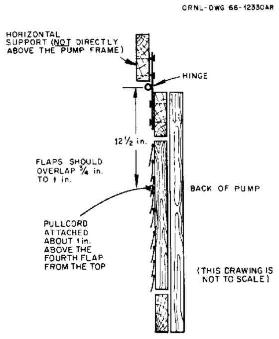This 6-ft-high pump requires 18 flaps, each the same size as those of the 36-in.-high KAP. The flaps on the lower part of a large KAP must withstand hard use. If 1/2-in.-wide strips of tape are attached along the bottom and side edges of these lower flaps, then even flaps made of ordinary 4-mil polyethylene will remain serviceable for over 1000 hours of pumping. However, the lower flaps of large KAPs can advantageously be made of 6-mil polyethylene. The width and spacing of all flaps should be the same as those of the 36-in.-high model.