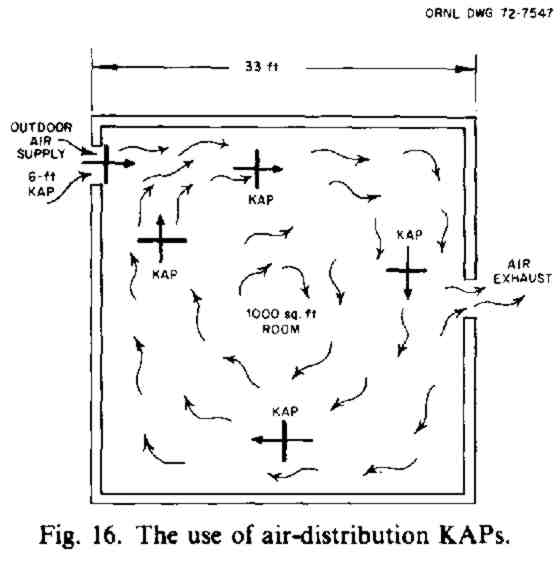 When used with a divider, a 36 X 29 in. KAP can pump almost 1000 cubic feet of air per minute into and out of such a shelter room. Although 1000 cubic feet of well distributed air is sufficient for several times as many as 25 shelter occupants under most temperate climate conditions, it is enough for only about 25 people in a one-entry room under exceptionally severe heat-wave conditions. Furthermore, to make it habitable for even 25 people under such conditions, the air in this room must be kept from rising more than 20 F above the temperature outdoors. This can be done using a second air-supply KAP to pump enough outdoor air through the building and in some cases also using air-distribution KAPs in spaces outside the one-entry room. The KAP in the doorway of a one-entry room should supply 40 cfm per occupant of this room.