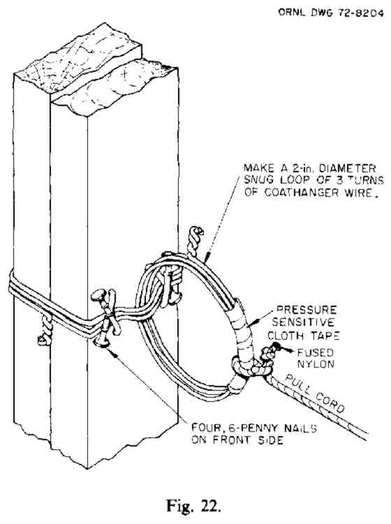 To make a durable connection of the pull-cord to the center vertical brace: (1) Attach a wire loop (Fig. 22) about l6-1/2 in. below the hinge line. This loop can be made of coat hanger wire and should go around the center vertical brace. This fixed loop should be kept from slipping on the center brace by bending four 6-penny nails over it in front as illustrated, and two smaller nails in back. (2) Make a free-turning, triple-wire loop connected to the fixed loop. (3) Cover part of the free-turning loop with tape and tie the pull-cord to this loop. Tie the pull-cord tightly over the taped part.