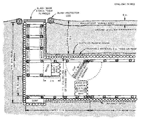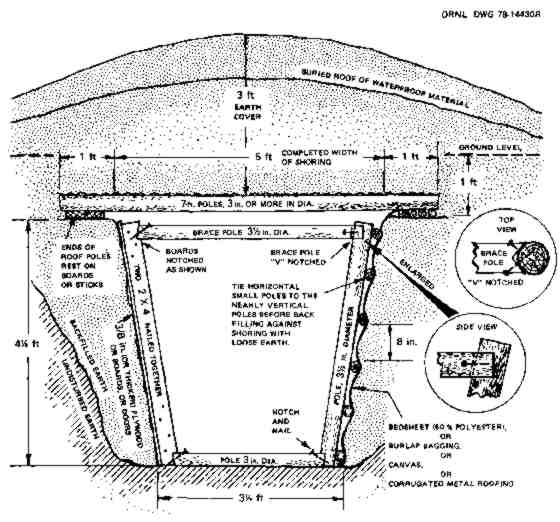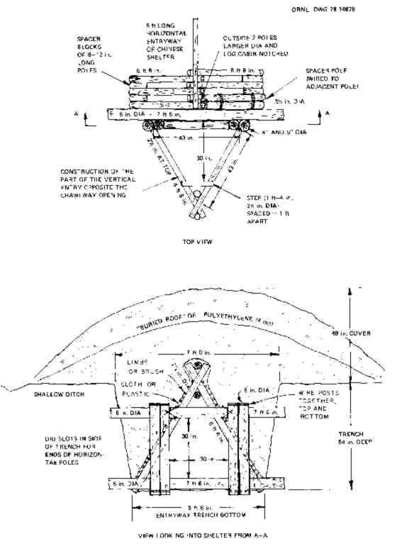 ° Build sufficiently long and strong entryways. Blast shelters need longer horizontal entryways, taller vertical entryways, and thicker earth cover than do most fallout shelters; these are needed primarily for increased protection against high levels of initial nuclear radiation. The entryways of the Small-Pole Shelter described in Appendix A.3 (with the improvements for increased blast protection outlined in the following section of this appendix) afford protection against both blast and radiation up to the 50-psi overpressure range. However, these entryways require straight poles 14 feet long; these may be difficult to find or transport.