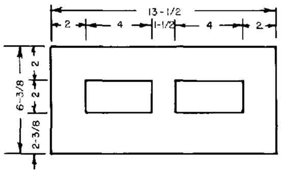 7. Preparatory to attaching side V to the PARTITION and to the two valve frames, drill 4 slightly oversize screw holes (for your 2-in. roundhead screws( through side V. Drill these holes so that a screw will go into an end of each valve frame about 1 in. from its adhered edge, and the other 2 screws will go into the side-edge of the PARTITION, at points above the valve frames. Next, with side V temporarily in its final position, drill with a smaller diameter drill through the 4 holes in side V, into the PARTITION and into the two valve frames. Then with the 4 screws temporarily connect side V, the PARTITION, and the two valve frames, and, while checking with a carpenter's square the squareness of the angle between the PARTITION and side V, adjust the two pairs of screws to attain squareness, Remove side V,