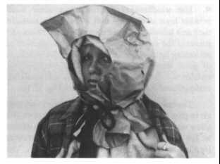 The head and neck of the girl pictured in Fig. 15.2 are insulated almost as well as if she were wearing the hood of a skin-side-out Eskimo parka. She folded a large, fluffy bath towel and placed it over her head, neck, and the upper part of her body. A brown paper bag was worn over the towel. The edges of the face hole cut in the bag were taped to prevent tearing. A strip of cloth was tied around the part of the bag over her neck. Such a parka-like covering not only is the most efficient way to insulate the head and neck but also prevents air warmed by the body from escaping upward around the neck. The girl also is wearing a man's shirt large enough to cover and hold thick newspaper insulation around her body and arms.