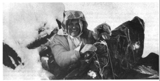 Newspaper and other paper through which water vapor can pass are such good windbreaker materials that they can be used under any loosefitting outer garment even one through which air can pass quite readily. They also provide good insulation. Figure 15.4 shows the author coming out of an icy shelter at sunup. Many thicknesses of newspaper covered my body and arms and extended like cuffs from my sleeves. A porous cotton bathrobe covered the newspapers and helped hold them in place. Because so little heat was lost through this clothing, plenty of warm blood continued to flow to my bare hands, ridding my body of excess heat by radiation.