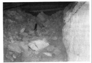 Several of these shelters had expedient blast doors which were closed during the tests. Figure D.2 shows the undamaged interior of the best expedient blast shelter tested prior to 1978, an improved version of the Small-Pole Shelter described in Appendix A. Its two heavy plywood blast doors excluded practically all blast effects; the pressure inside rose only to 1.5 psi an overpressure not nearly high enough to break eardrums. The only damage was to the expedient shelter-ventilating pump (a KAP) in the stoop-in entryway. Two men worked about 5 minutes to replace the 4 flap-valves that were blown loose.
