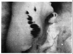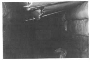 ° Shore earth walls to prevent their caving in as a result of ground shock and earth pressure. Most unshored (that is, unsupported) earth walls are partially collapsed by ground shock at much lower blast overpressures than those at which a flexible roof protected by earth arching is damaged. Figure D.5 is a picture of a seated dummy taken by a high-speed movie camera mounted inside an unshored, Pole- Covered Trench Shelter of the Russian type tested at the 20-psi range. (A second dummy was obscured by blast-torn curtains made of blankets.) The shelter had an open stairway entryway, positioned at right angles to the stand-up-height trench and facing away from the targeted "city" so as to minimize the entry of blast waves and blast wind.
