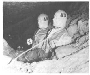 Fig. D.6. Dummies after ground shock from 1-kiloton blast effects at the 20-psi range had collapsed the rock-like walls of a hardened desert soil called caliche. The dummies' steel "bones" and "'joints" prevented them from being knocked down and buried. The fallen caliche all around them kept them from being blown over by the air blast wave and 180-mph blast wind that followed.