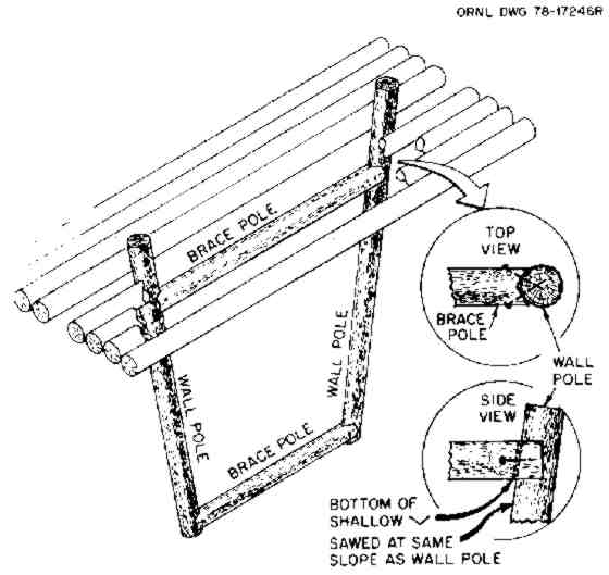 If these brace poles are driven downward when positioned as shown, the two wall poles are forced outward against the shoring materials placed between them and the earth walls. An upper brace pole should be cut to the length needed to make it approximately the same height as the roof poles on each side of it (no higher) after the shoring is tightened. Finally, each "V"-notched end should be nailed to its wall pole.