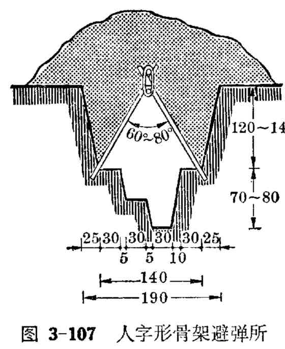 Figure D.1 shows a Hiroshima shelter that people with hand tools could build in a day, if poles or timber were available. This shelter withstood blast and fire at an overpressure range of about 65 psi. Its narrow room and a 3-foot-thick earth cover brought about effective earth arching; this kept its yielding wooden frame from being broken.
