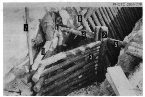 The two pairs of vertical posts (2) were positioned so that they pressed against two 7-1/2-foot horizontal poles (5); only the uppermost is shown. These in turn pressed against the outermost two poles (6) of the horizontal entry and against the earth in two slot-trenches dug in the sidewalls of the excavation. These two 7-1/2-foot poles (5) should be at least 6 inches in diameter.