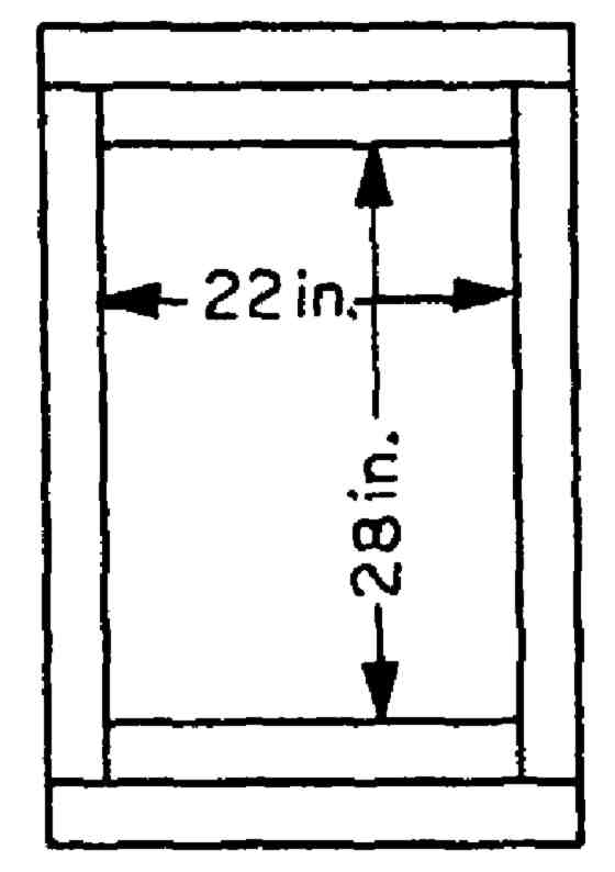 To withstand 50 psi, the load-bearing "2-inch" boards (actually 1-1/2inches thick) of the valve should be at least 6 inches wide, if the 1-in.-high air openings are each made 12 in. wide, measured between two vertical poles of a shelter entry. See Fig. D.19, that gives the dimensions of a valve that has been blast tested.5 Note that there are 5 inches of solid wood at each end of each 1-in.-high air opening. If there are 5 such air openings to a valve, a properly installed KAP (Appendix B) can pump air at about 125 cubic feet per minute (125 cfm) through a shelter equipped with such valves. This ventilation rate is ample for at least 40 people in cold weather. Except in hot and humid weather, a constant air supply of about 10 cfm per shelter occupant is enough to maintain tolerable conditions during continuous shelter occupancy for many days.