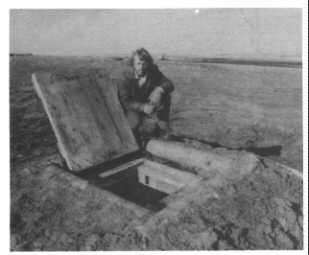 To prevent possibly life-endangering cave- in of the 13-foot-deep trench that was dug for the blast testing of this model shelter, the trench walls were sloped about 45 degrees. The shelter was built as a braced, free-standing structure, and then covered. During a crisis it would be impractical to safely excavate a deep trench with steeply sloping walls and then safely build a shelter in it. A 13-foot-deep trench is usually too deep to dig by hand-especially since to dig it with safely sloping walls requires the removal of a large amount of earth.