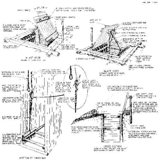 ° Equipped with blast doors each made of 5 sheets of 3/4-inch exterior plywood (see Fig. D.15) bonded with resin glue and nailed together with 4-1/2 in. nails. The nails should be driven on 4-in. spacings and their protruding ends should be clinched (bent over). The blast doors must be secured against being yanked open by negative pressure ("suction") by securing them with a strong wire bridle (see Fig.-D.14), and with the lower, fixed wire strongly connected near the bottom of the entry to all of the vertical poles on one side, as shown in Fig. D.14.