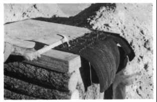 Fig. D.15. Tire-strip hinges nailed to an expedient, 4-inch-thick blast door made of plywood, designed to withstand 50-psi blast effects of very large weapons and undamaged by blast at the 53-psi range. Fig. D.16. Blast-tested triangular blast door made of hand-hewn pine poles, notched and nailed together. This door closed on a triangular pole base that is concealed in this photo by two of the three blast-protector logs that also withstood 53-psi blast effects. Fig. D.17. Hewing flat sides on a pole with a sharp ax.
