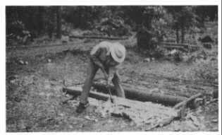 Many Americans have axes and would be able to cut poles, but not many know how to use an ax to hew flat, square sides on a pole or log. This easily acquired skill is illustrated by Fig. D.17. The worker should first fasten the pole down by nailing two small poles to it and to other logs on the ground. Figure D.17 shows a pole thus secured. When hewing a flat side, the worker stands with his legs spread far apart, and repeatedly moves his feet so that he can look almost straight down at where his ax head strikes. First, vertical cuts with a sharp ax are made about 3 or 4 inches apart and at angles of about 45 degrees to the surface of the pole, for the length of the pole. These multiple cuts should be made almost as deep as is needed to produce a flat side of the desired width. Then the worker, again beginning at the starting end, should cut off long strips, producing a flat side.
