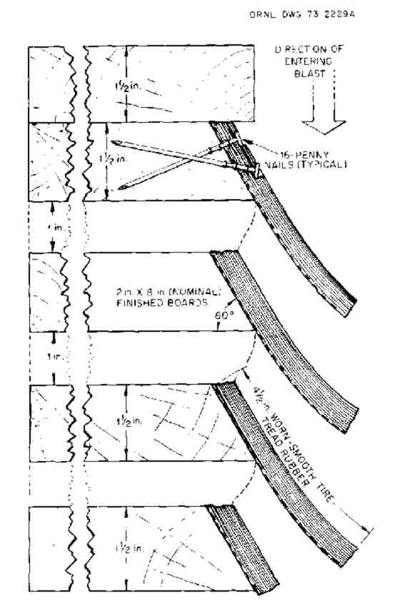 Figure D. 15 shows a blast door made of 5 thicknesses of 3/4-inch exterior plywood, well glued and nailed together with 4-1/2-in. nails at 4-in. spacings. This door was protected by 4 blastprotector logs, each 8 feet long and about 8 inches in diameter. The logs were notched, nailed together, and surrounded with earth. For protection against ignition by the thermal pulse from an explosion, exposed wood and rubber should be coated with thick whitewash (slaked lime) or mud, or covered with aluminum foil.