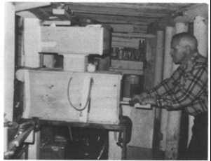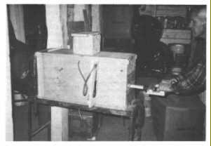 I measured the pressure differences against which the pump was operated. In a shelter these differences typically are caused by the resistance to airflow in pipes, valves, and a filter. I measured pressure differences in inches water gauge (1 in. w.g. 0.036 psi) with the small-tube manometer attached to the side of the pump. To produce various pressure differences for several tests, I nailed a piece of plywood over the top of the air-intake duct, so as to produce different sized openings: in most tests I placed different layers of filter materials in a filter box that was fitted airtight over the 6 x 6-in. air-supply duct on the top of the pump. See Fig. 3. (This low-resistance filter removes practically all fallout particles of wartime concern, and also most infective aerosols that may be used in biological warfare. See "Making and Using a Homemade Filter Box and Filter", by Cresson H. Kearny, October 1985.