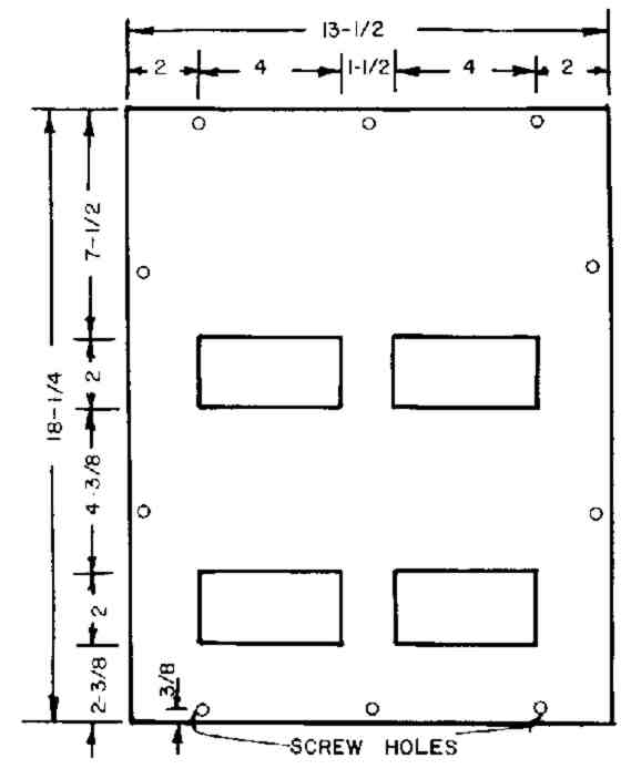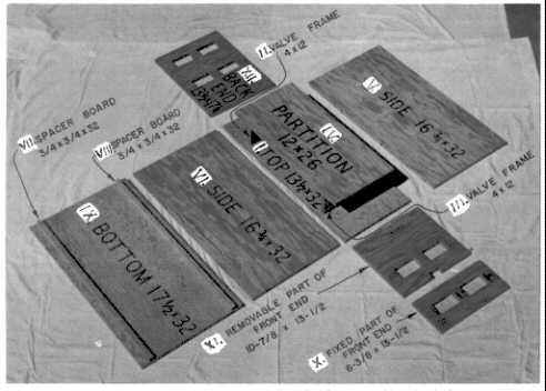 7. Preparatory to attaching side V to the PARTITION and to the two valve frames, drill 4 slightly oversize screw holes (for your 2-in. roundhead screws( through side V. Drill these holes so that a screw will go into an end of each valve frame about 1 in. from its adhered edge, and the other 2 screws will go into the side-edge of the PARTITION, at points above the valve frames. Next, with side V temporarily in its final position, drill with a smaller diameter drill through the 4 holes in side V, into the PARTITION and into the two valve frames. Then with the 4 screws temporarily connect side V, the PARTITION, and the two valve frames, and, while checking with a carpenter's square the squareness of the angle between the PARTITION and side V, adjust the two pairs of screws to attain squareness, Remove side V,
