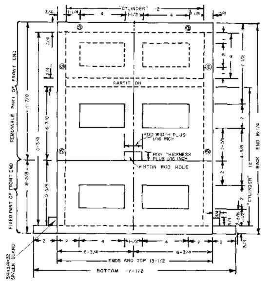 b. To the end of the piston rod (see Fig. 14) adhere and screw (or adhere and nail if your piston rod is not oak) two pieces of nominal 1 x 2-in. boards each 3 in. long. Each of these two small boards and the end of the piston rod are in contact with and securely connected to the plywood piston, and form a perfect "T" at the end of the piston rod.