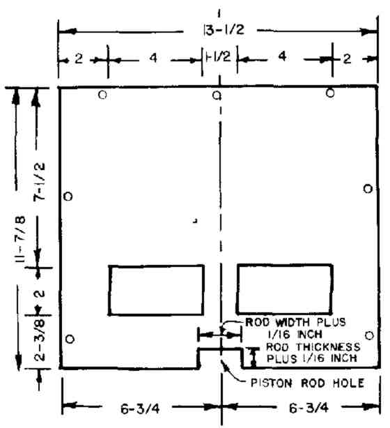 a. On the back of the 12 x 12-in. plywood piston, mark lines to enable you to attach the piston rod as pictured in Fig. 14. Note that the lower side of the piston rod is exactly 5-1/2 in. above the lower edge of the plywood of the piston, and that the center line of the piston rod intersects the vertical center line of the plywood of the piston.