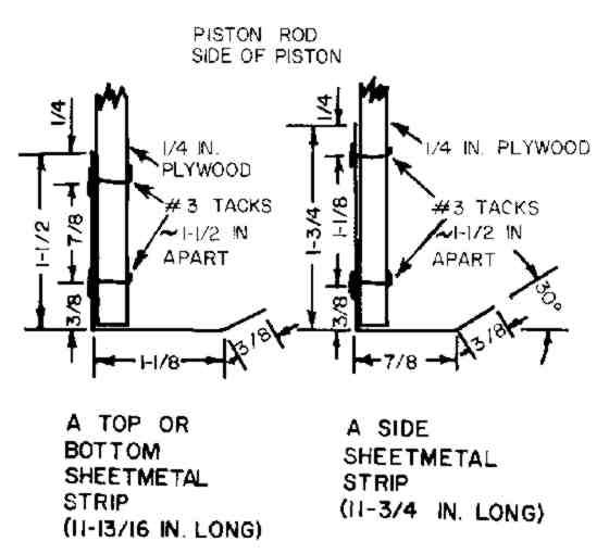4. Attach the four sheetmetal sealing strips to the plywood piston with No. 6 tacks (1/2-in. long). Place on a solid metal surface the part of the plywood piston opposite the spot to which part of a strip is being tacked, so that when a tack is hammered in its point is clinched (bent over) on the far side of the 3/8-in.-thick plywood piston, by being hammered against the solid metal surface.