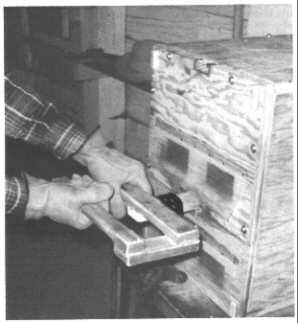 f. Bend the exposed part of the strip about 30 degrees off the vertical, away from the side of the strip where the holes have been indented by the punch. To bend evenly, hammer gently and repeatedly on a 3/4 x 3/4 x 18-in. board held against the exposed 3/8-in.-wide part of the strip.
