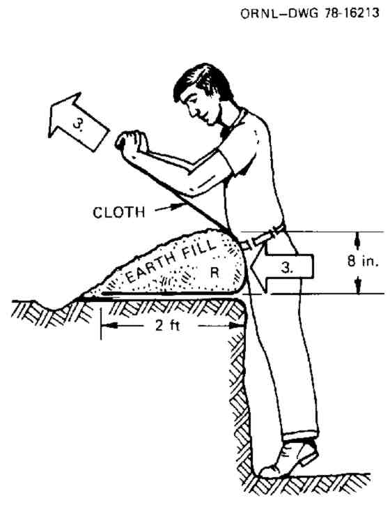 (3) While using both hands to hold up and pull on 3 ft of the width of the cloth and pressing against the cloth with your body, have another person shovel earth onto and against the cloth.
