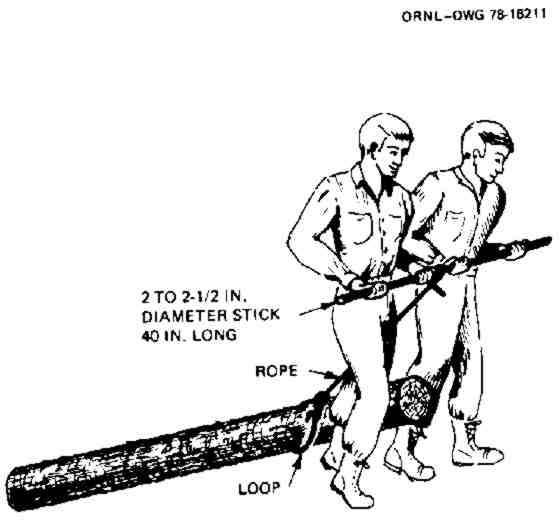 To drag a log or several poles by hand: (a) Cut a stick 2 to 2-1/2 in. in diameter and about 3-1/3 ft long; (b) Tie a short piece of 1/4-in. (or stronger) rope to the center of the stick; (c) Make a lasso-like loop at the free end of the rope, so that when it is looped around the log and two people are pulling (see illustration), the front end of the log is raised about 6 in. above the ground. The loop should be tightened around the log about 2 ft. from its end, so that the end of the log cannot hit the backs of the legs of the two people pulling it.