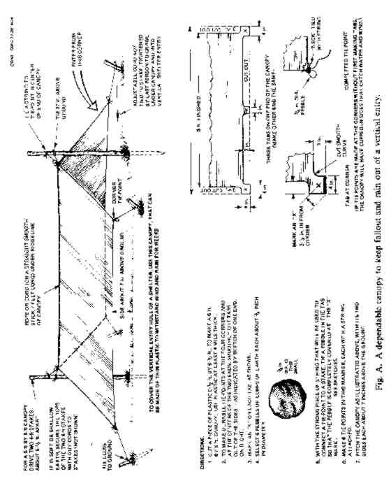 15. Make a reliable canopy over the shelter entry. By following the instructions given in Fig. A on the following page, you can make a dependable canopy that ordinary winds will neither tear nor blow down and that will not catch rainwater even if you have no waterproof material stronger than 4-mil polyethylene film.