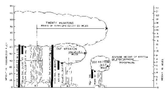 (Illustration) Fig. 6.4. Stabilized Radioactive Fallout Clouds Shown a Few Minutes After the Explosions, with distances that spherical fallout particles having diameters of 40, 50, and 100 microns fall in 8 hours.6