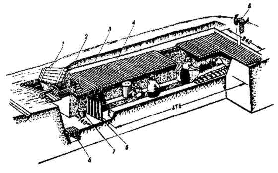 (Illustration) Fig. 6.5. [Figure 20.] Wood-Earth Shelter without Lining of the Walls for Clay Soils, 10 Occupants: 1 - Trap Door; 2 - Dust Filter with a Straw Packing (hay); 3 - Earth Cover 60-80 cm thick; 4 - Roofing made of Poles; 5-Exhaust Duct with Damper; 6 - Curtain made of Tightly Woven Cloth; 7 - Removable Container for Wastes; 8- Water Collecting Sump.