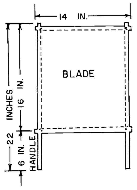 The blade frame is covered on both sides with strong bedsheet cloth, that is wrapped around and secured to the strong cords or wires tied to notches cut in the boards or sticks) near the 4 corners of the blade. (If cord or wire is not available. 4 2-inch-wide strips of strong cloth, slightly twisted, serve well.)