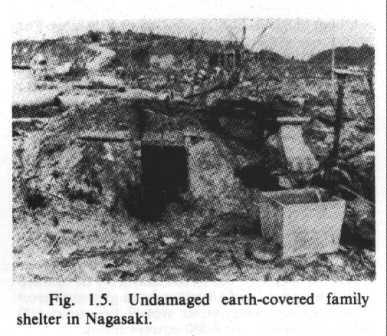 Many earth-covered family shelters were essentially undamaged in areas where blast and fire destroyed all buildings. Figure 1.5 shows a typical earth covered, backyard family shelter with a crude wooden frame. This shelter was essentially undamaged, although less than 100 yards from ground zero at Nagasaki.4 The calculated maximum overpressure (pressure above the normal air pressure) was about 65 pounds per square inch (65 psi). Persons inside so small a shelter without a blast doorwould have been killed by blast pressure at this distance from the explosion. However, in a recent blast test,5 an earth-covered, expedient Small-Pole Shelter equipped with blast doors was undamaged at 53 psi. The pressure rise inside was slight not even enough to have damaged occupants' eardrums. If poles are available, field tests have indicated that many families can build such shelters in a few days.