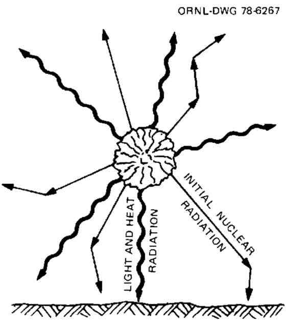 The main dangers from an air burst are the blast effects, the thermal pulses of intense light and heat radiation, and the very penetrating initial nuclear radiation from the fireball. ORNL.DWG 78.6267