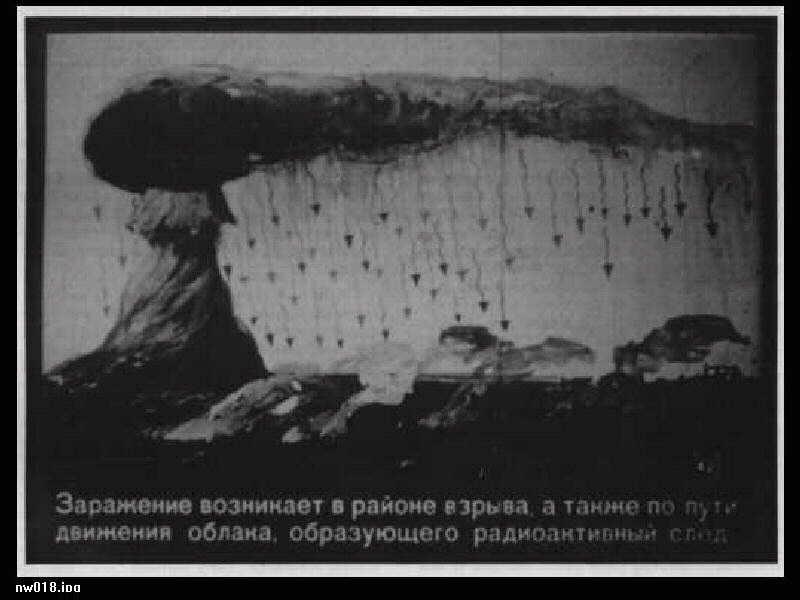Translation: [Radioactive] contamination occurs in the area of the explosion and also along the trajectory of the cloud which forms a radioactive track.