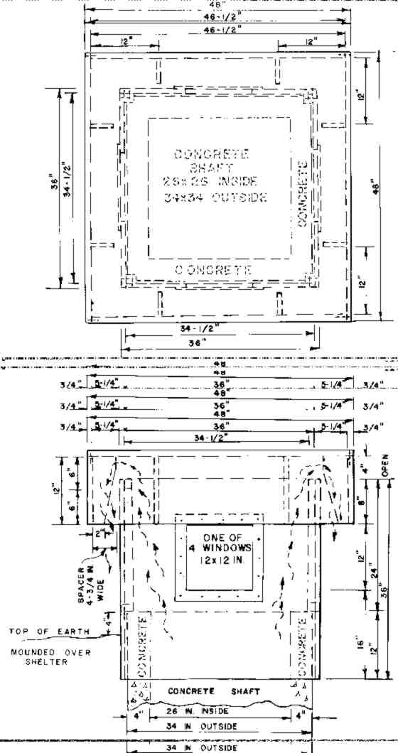 Then air entering the shelter room will have to rise at least 4 feet above the entryway floor, and most of the larger fallout particles will be deposited on the entryway floor.)