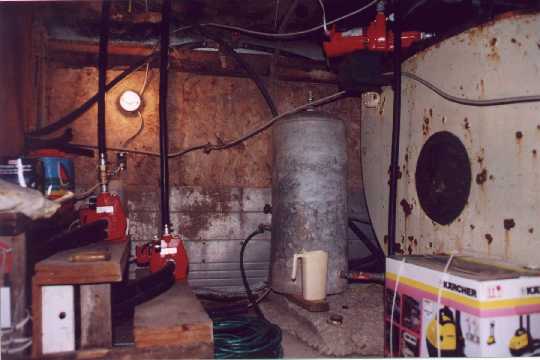 This picture shows the heart of the water pressure and storage system. The two lower pumps are both one horsepower pumps that together can pump better than 15 gallons per minute. We can refill the top half or our settling tank (the big 500 gallon stainless steel white tank that you can just see the end of on the right), in about 15 minutes, and then turn back off the generators. (We also have a back up hand winch and bucket).