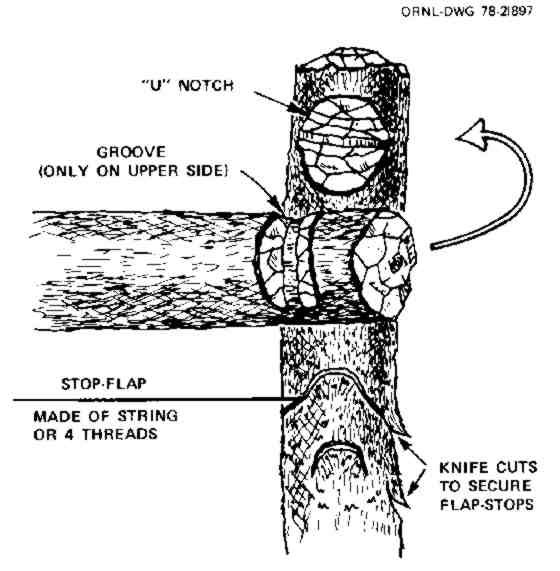 Small, yet efficient KAPs can be made even if the only materials available are straight sticks about 1-1/4 inches in diameter, strips of cloth to tie the frame together and to make the hinges and the pull cord, polyethylene film from large trash bags for the flaps, freezer or duct tape (or needle and thread) to make the flap hems, coat hanger wire or string for the pivot- wire, and string or ordinary thread for the flap-stops. A sharp knife is the only essential tool. Figure 21 shows a way to easily tie sticks securely together and to attach strings or threads for stop-flaps, when small nails and tacks are not available. The flap-stop strings or threads should be secured by wrapping them several times around each stick to which they are attached, so they will be gripped by the out-of-line knife cuts.
