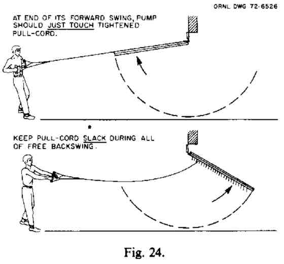 2. Stand at such a distance from the pump that you can pull the pump toward you until the forward- swinging pump just touches the tightly stretched pull-cord and at such a distance that you can keep the pull-cord slack during the whole of the pump's free backswing.