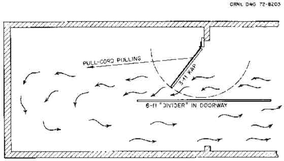 Below such a doorway KAP, a "divider" 6 ft to 8 ft long can be installed. The divider permits exhaust air to flow out of the room without much of it being "sucked" back into the room by the KAP swinging above it. Plywood, reinforced heavy cardboard, or even well-braced plastic can be used to make a divider. It should be installed so that, in a possible emergency, it can be jerked out of the way in a few seconds.